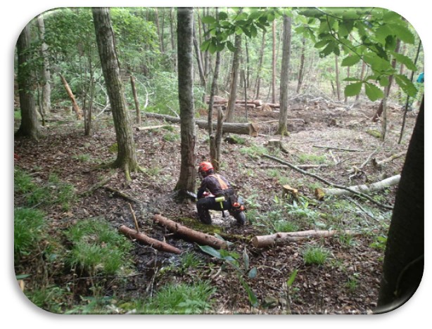当社は、令和7年の3月より、建設会社である(株)山下組より独立した創設して間もない会社です。仕事内容は国有林内の森林整備事業が中心です。具体的には、森林内で木々の密度を適正にするための間伐を行い、作業道を通し、伐採した木を丸太にして林内に品質別に貯木するといった作業の流れになります。